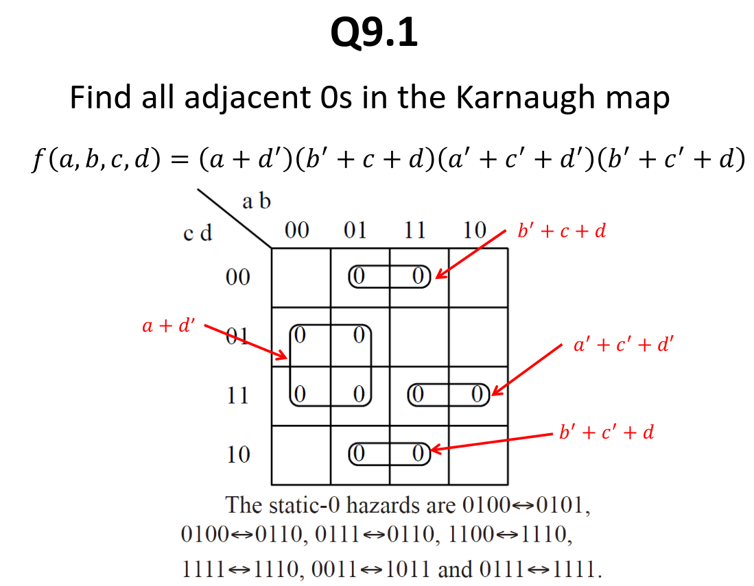 Identify the Hazards: Look at the K-map in Q9.1. A hazard exists at any boundary between two