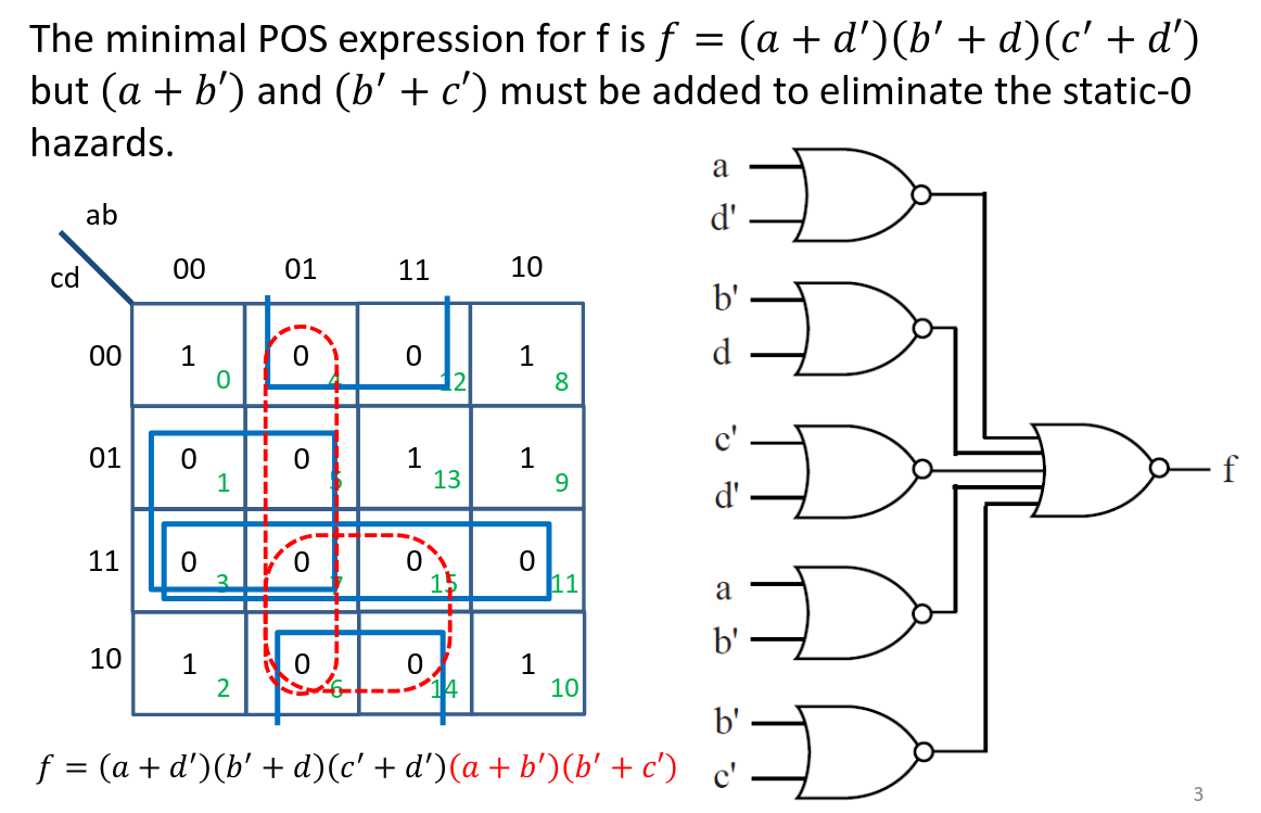 Final Equation: Combine the minimal terms (Blue) and the hazard-protection terms (Red): $\(f = \underbrace{(a+d')(b'+d)(c'+d')}_{\text{Minimal Logic}} \underbrace{(a+b')(b'+c')}_{\text{Hazard Protection}}\)$