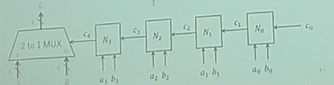 (Note: For block \(N_4\), the input labeled 'a' receives signal \(b_4\), and input 'b' receives signal \(a_4\). This effectively inverts the logic for the sign bit comparison.)