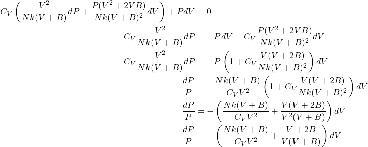 \(\frac{Nk}{C_V}\frac{V+B}{V^2} = \frac{Nk}{C_V}\left(\frac{1}{V} + \frac{B}{V^2}\right)\).