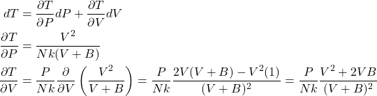 \(dT = \frac{V^2}{Nk(V+B)} dP + \frac{P(V^2+2VB)}{Nk(V+B)^2} dV\).