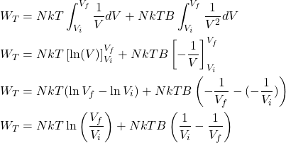 \(W_T = \int_{V_i}^{V_f} \left(\frac{NkT}{V} + \frac{NkTB}{V^2}\right) dV\)